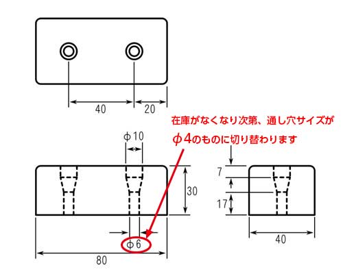 - 本製品は若干の仕様変更が予定されています。変更内容は、通し穴がφ6からφ4へ調整される点です。φ6の在庫がなくなった段階で順次φ4品に移行される予定です。できるだけ混在して出荷することがないよう留意したいと考えておりますが、タイミングによっては混在される可能性があることをご理解頂けますと幸いです。